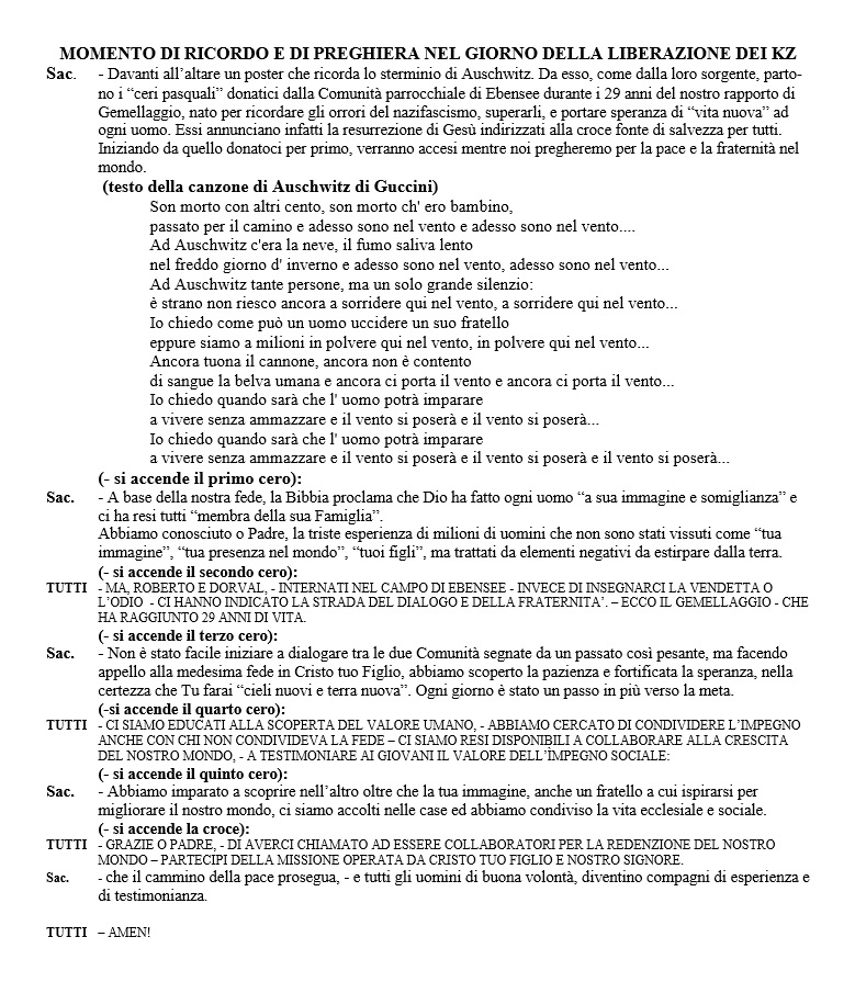 - Ad Ebensee, in Austria, dove questa nostra Comunità condivide con la città, un rapporto di gemellaggio “nel ricordo…” della deportazione di centotrentasette pratesi, si usa una casula liturgica realizzata nei colori della bandiera nazionale, fatta appositamente dipingere all’artista Mihu che, condividendo il rapporto di Gemellaggio, lo ha arricchito di tanti altri “segni” per gli incontri fra le due Parrocchie.